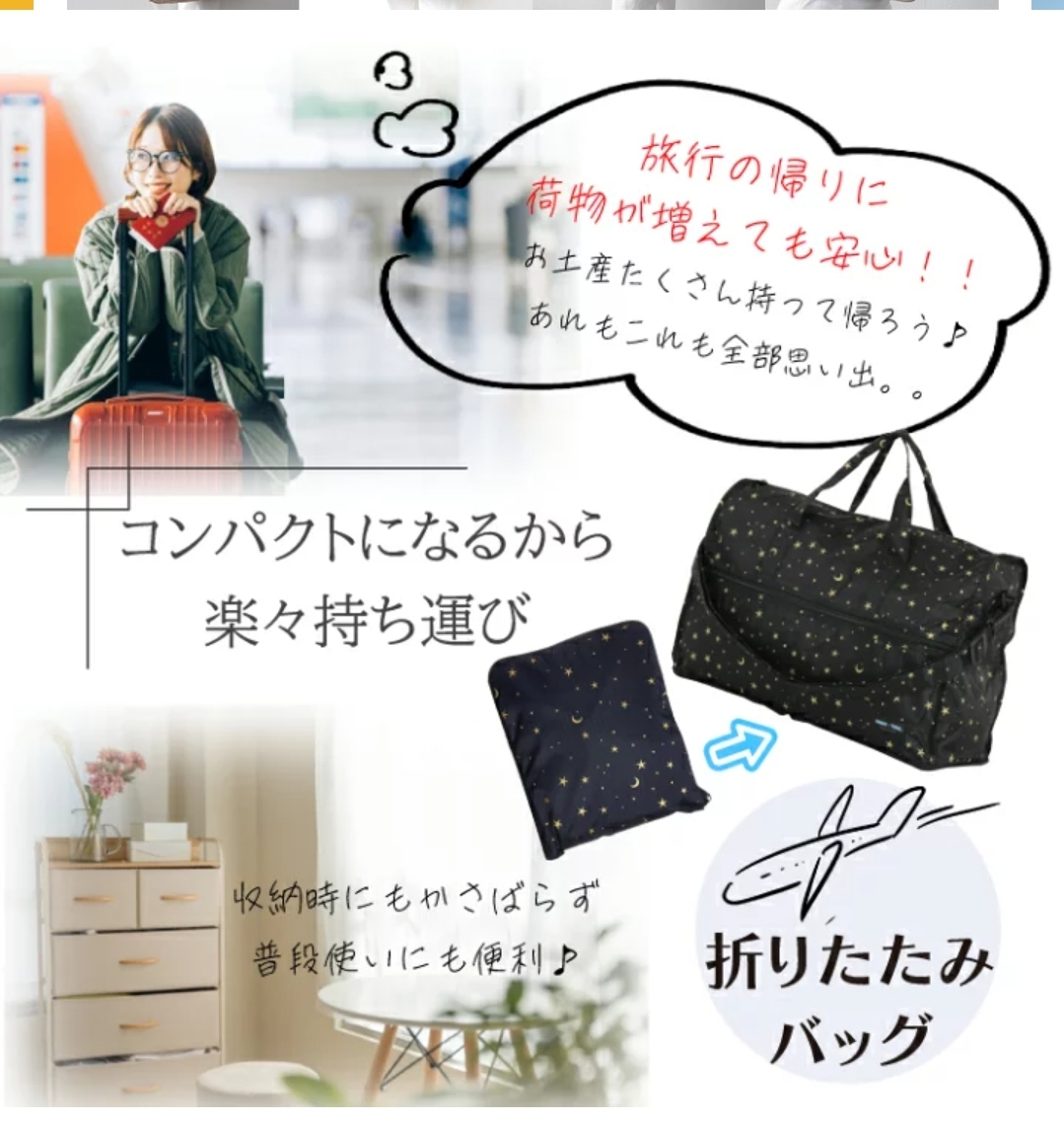 HAPITAS Boston L กระเป๋าพับขนาดใหญ่แบรนด์จากประเทศญี่ปุ่น ลายน่ารัก สินค้าลิขสิทธ์แท้จากดีไซน์เนอร์ญี่ปุ่นมีให้เลือกหลากหลายลาย กระเป๋าสามารถพับเก็บได้ สะดวกสำหรับเดินทาง ไม่เปลืองเนื้อที่ได้การจัดเก็บ วัสดุทำจากผ้า Polyester ลักษณะคล้ายผ้าร่ม นํ้าหนักเบาเพียงแค่ 500 กรัม ความจุได้ถึง 38 ลิตร สามารถกันละอองนํ้า ละอองฝนได้ ด้านหลังกระเป๋ามีช่องเพื่อใช้เสียบลงไปที่ก้านคันชักกระเป๋าเดินทาง สะดวกในการลากกระเป๋าและปลอดภัยจากกระเป๋าหล่นหาย